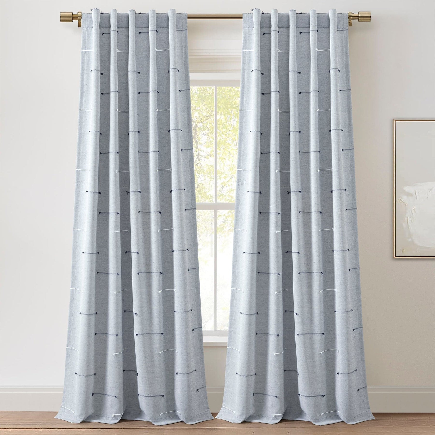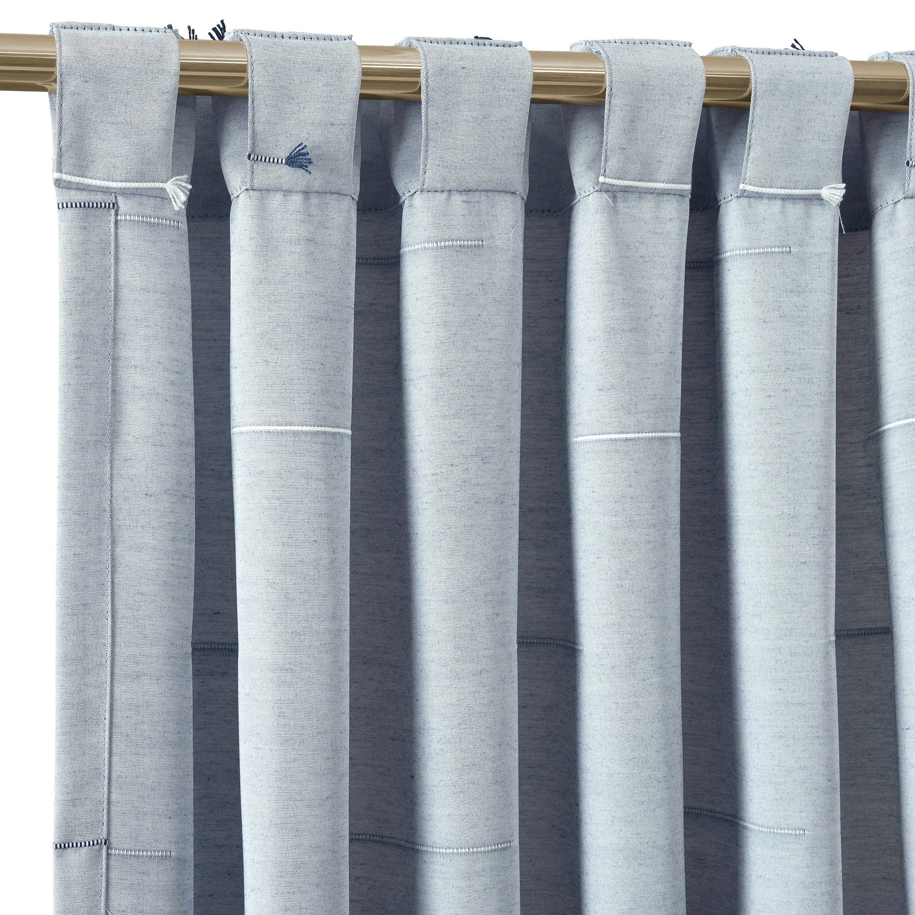The Boho Stripe Clip Jacquard Window Curtain Panel Set is sold by the pair. Each panel measures 84 inches in length and 42 inches wide. Having a 3-inch back tab rod pocket gives you three options for hanging these panels. You can either slide the panel right onto the curtain rod, slide the curtain rod through the back tabs, or you can hang the panels by clip rings from the curtain rod.