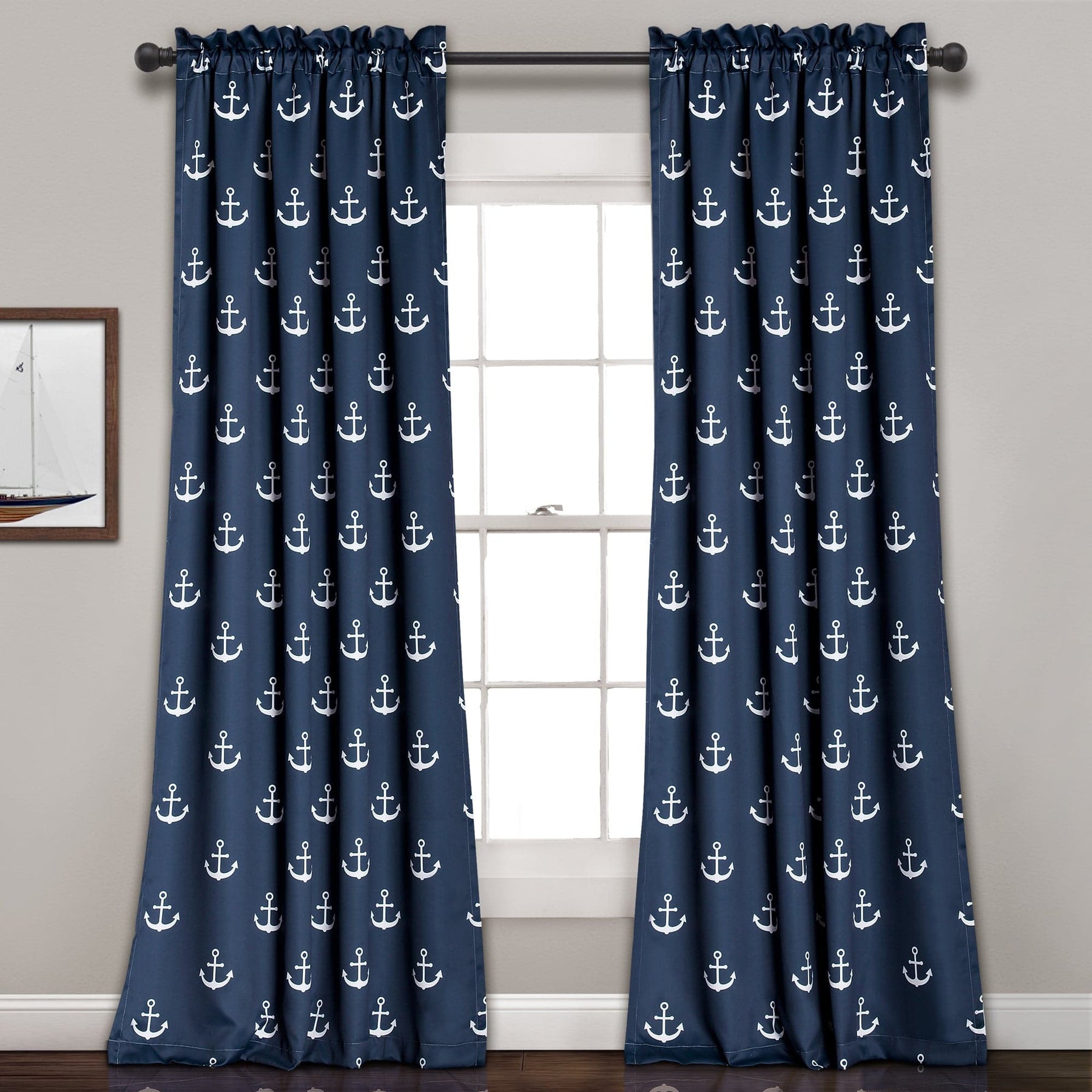 An adorable collection of anchors is distributed throughout this iconic coastal style curtain set. As an added bonus to this eye pleasing Anchor Light Filtering Window Curtain Set, it offers room darkening capabilities that come in handy on a hot summer day.