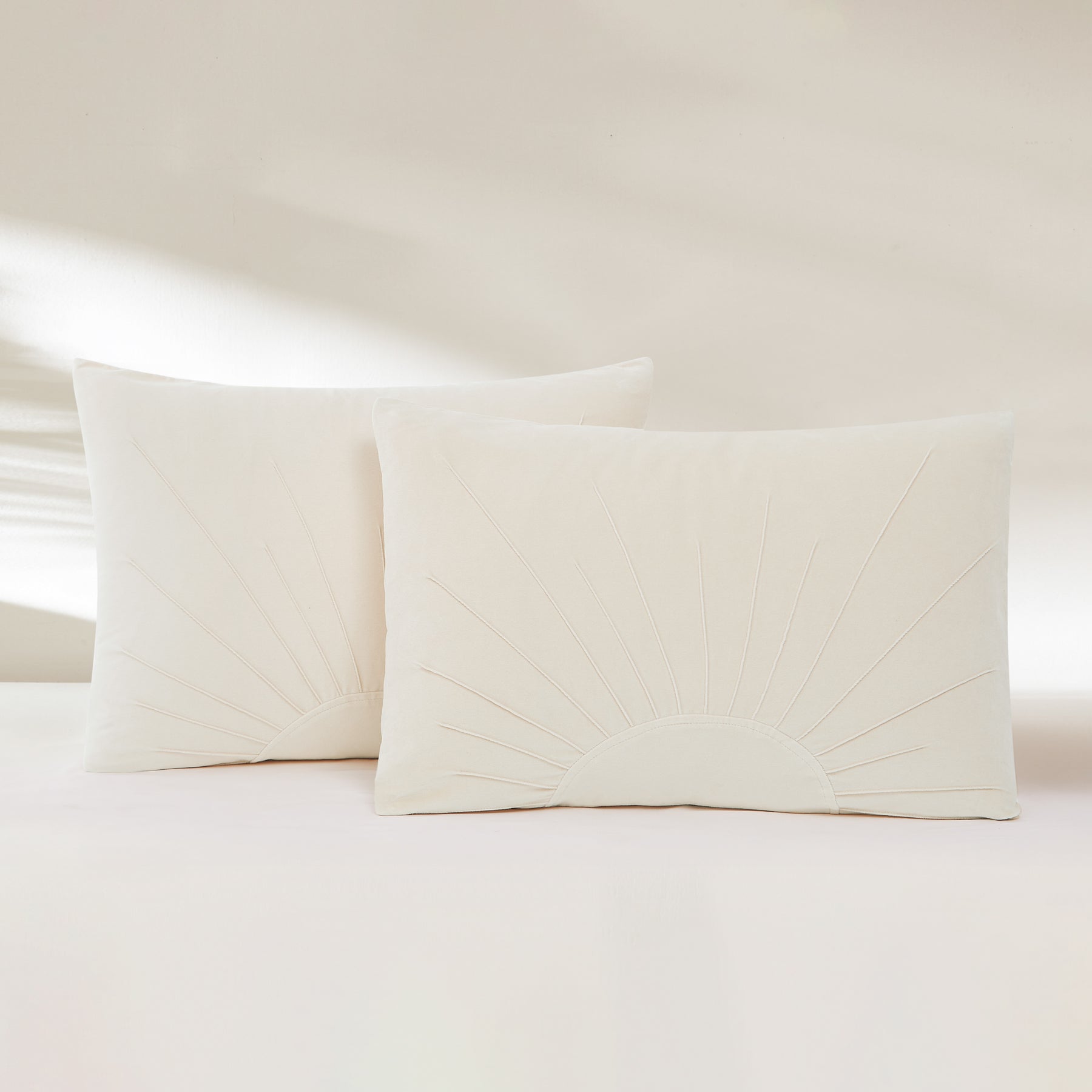 The Solar Drift Velvet Comforter Set brings a sense of radiance and renewal to your bedroom. Inspired by the rising sun, crisp pintuck pleats extend outward in graceful arcs, adding dimension and movement to the luxuriously soft, textured velvet surface. Balanced with a smooth cotton backing for comfort, this design feels as inviting at night as it does when you wake to greet the day. The medium-weight fill ensures cozy warmth in every season, making it a timeless layer of modern style and comfort.