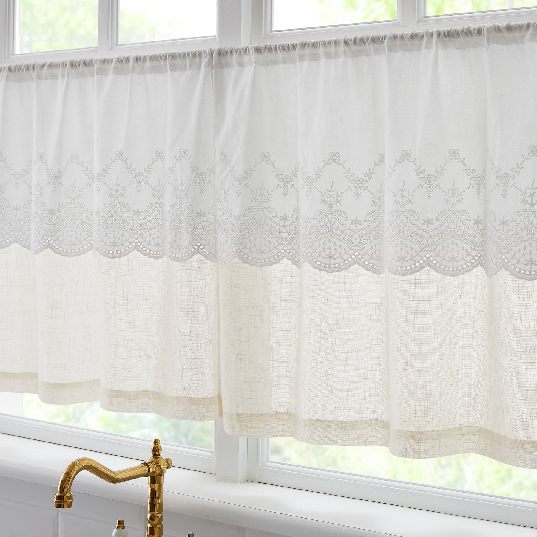 This charming kitchen tier set features an attached valance with eyelet embroidery and scalloped edges and is great in a country cottage style home. The cotton valance overlays a textured linen blend panel. These cafe curtains provide moderate privacy and allowing some light to pass through. Sold as 2 panels, each measuring 29 inches wide by 24 inches long. Easy to install with a 1.5" rod pocket, to slide onto a curtain rod or by using clip rings (not included). Machine washable for easy care.