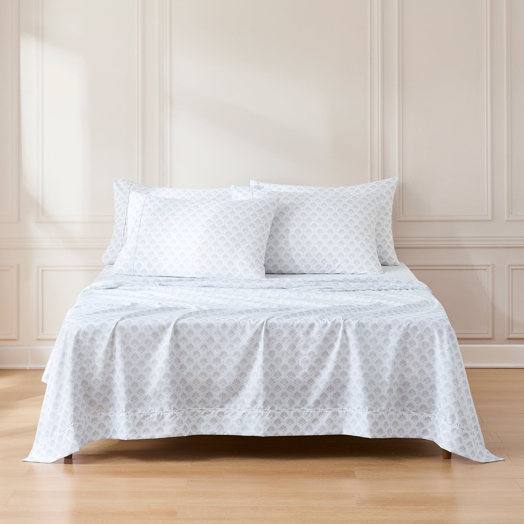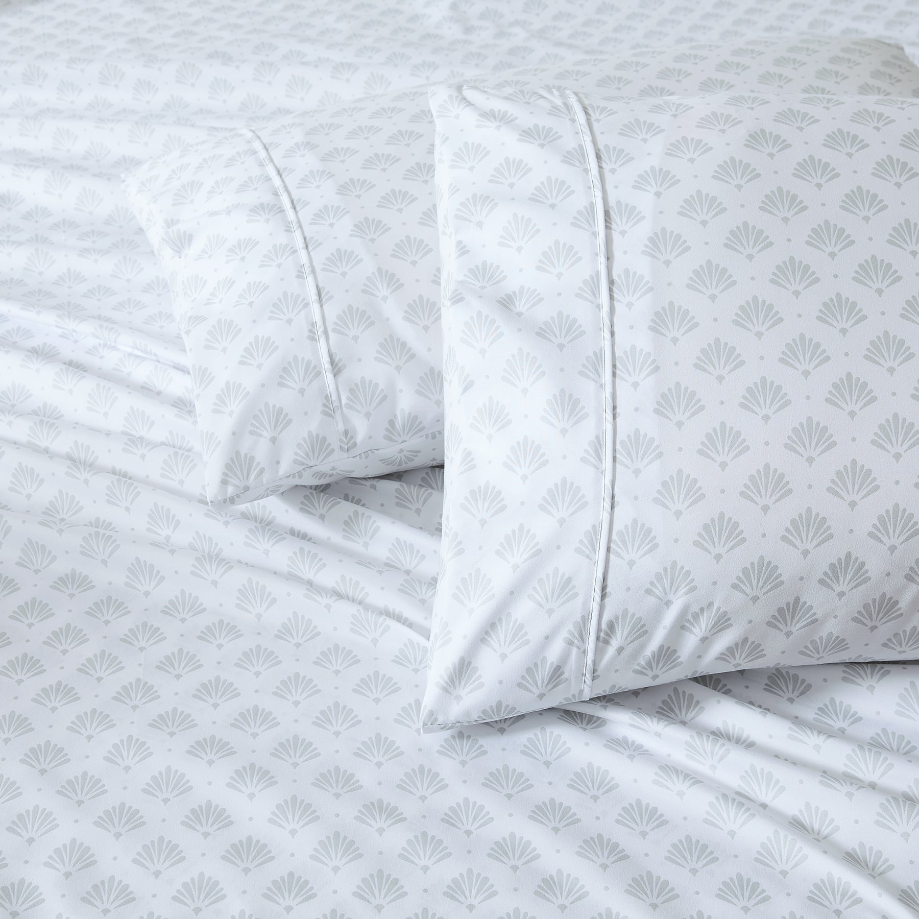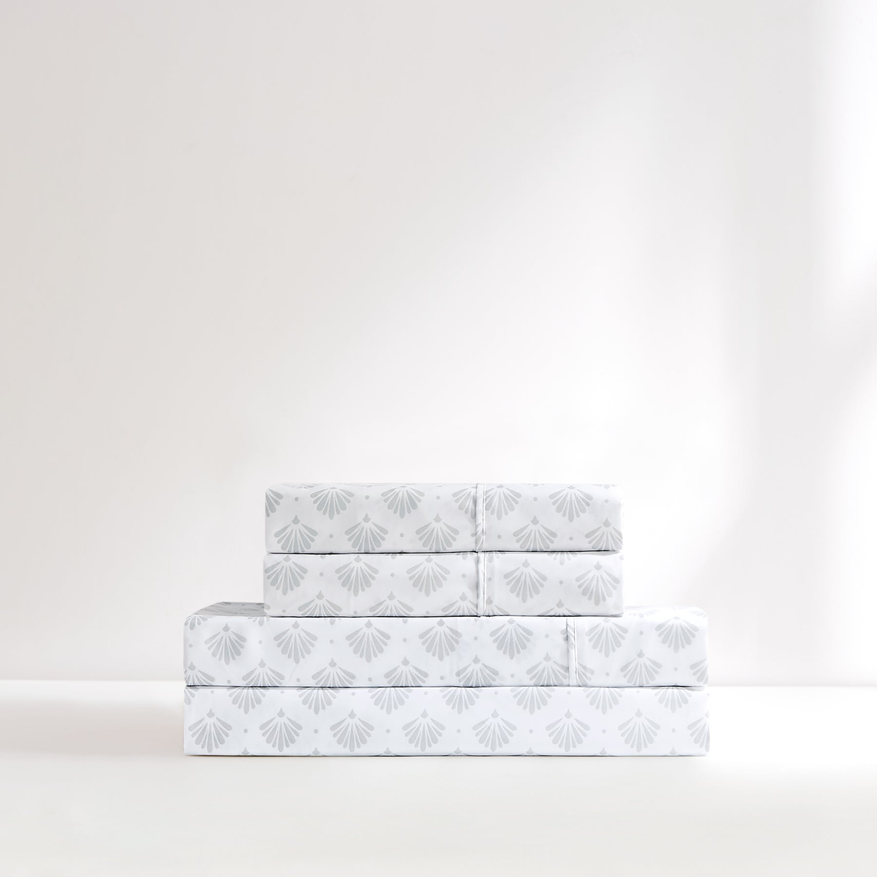 Seriously soft sheet set inspired by art-deco designs. These neutral print sheets feature a patterned scallop fan motiff perfectly suited to a vintage-glam aesthetic.