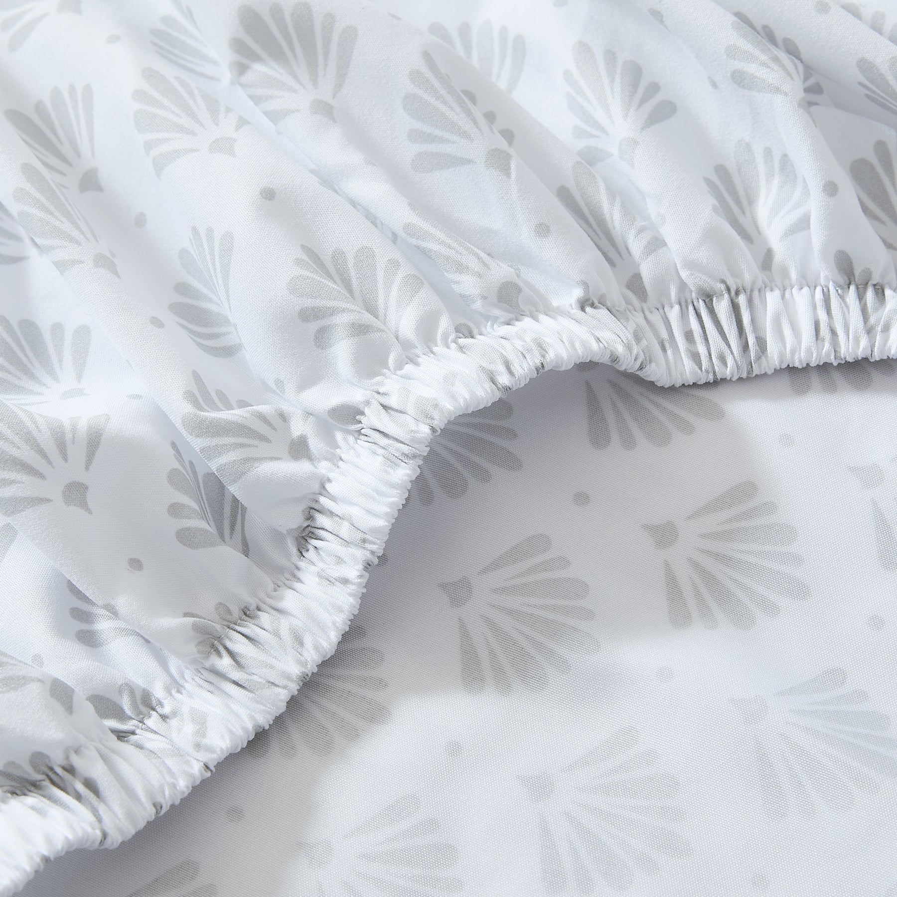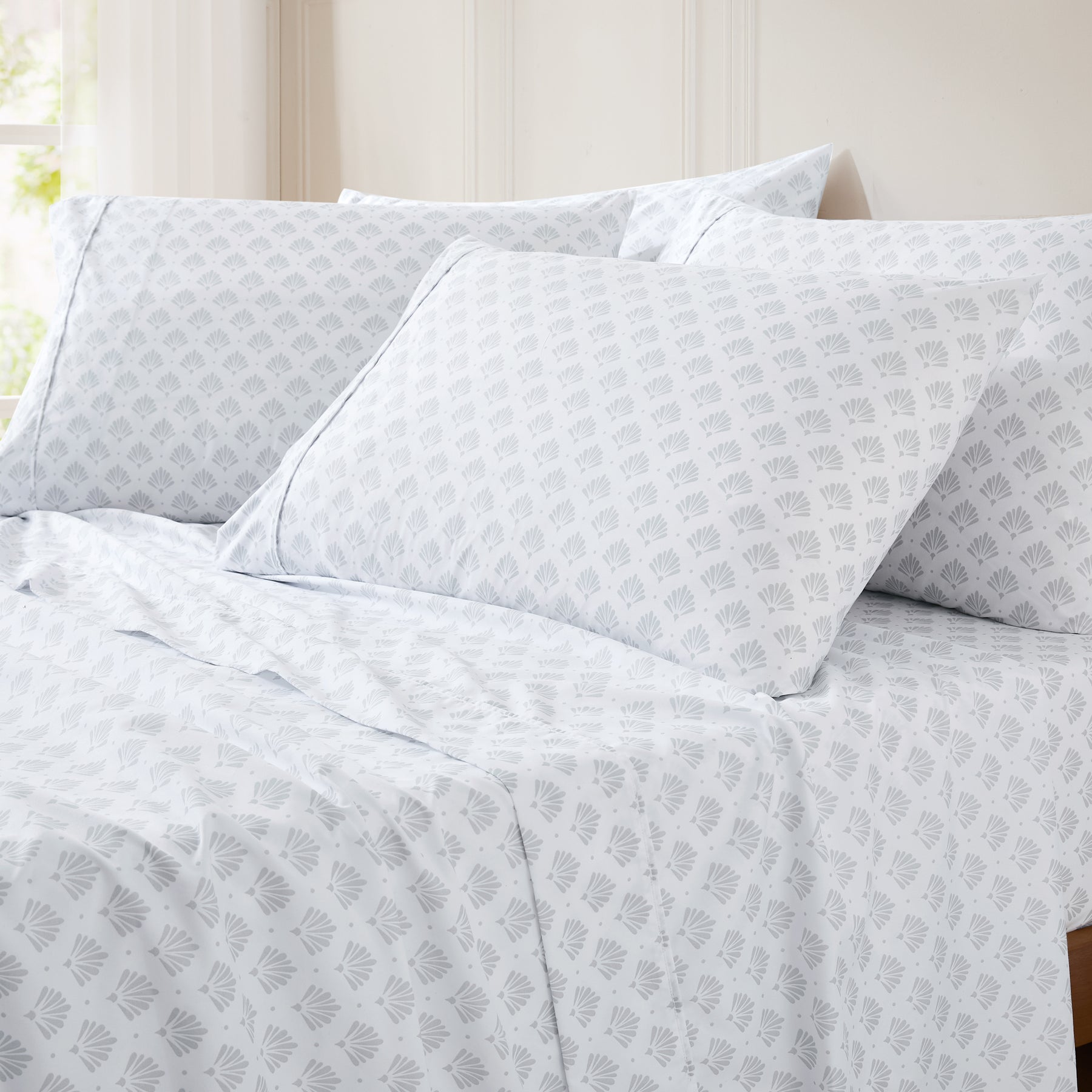Add timeless art deco style to your bedroom with this beautiful sheet set. Easy to style, these neutral bed sheets display a pattern of fan-shaped motifs, inspired by the vintage-glam aeshtetic. These soft sheets are the soft centerpiece you need for an art deco, glam, or modern style bedroom. Crafted from a soft microfiber, this multi-piece set includes 1 flat sheet, 1 fitted sheet with a 14" drop pocket, and 2 or 4 pillowcases. STANDARD 100 by OEKO-TEX® certified, all components have been tested and certified free from harmful substances. Machine washable.