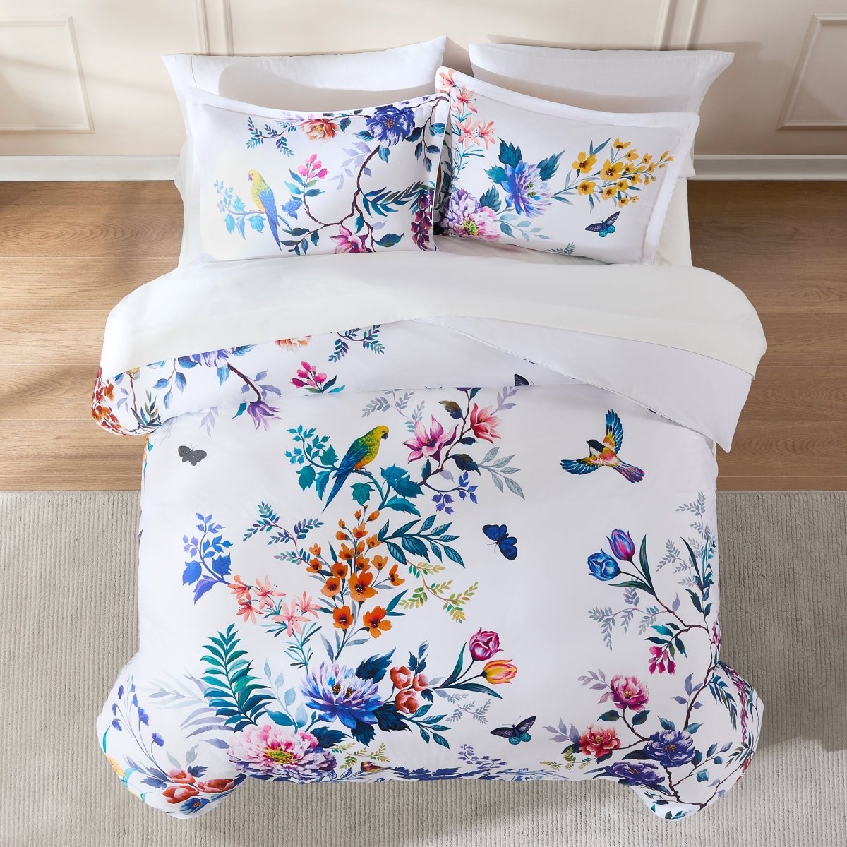 Rest in a forest of florals with this colorful duvet cover set. Ideal for a modern or maximalist styled space, displaying a bold floralscape with a solid white backing. Crafted from 100% cotton, this 3 piece bedding set includes 1 duvet cover and 2 shams. Add your ideal insert weight for year-round comfort and easily secure it with button closures and corner ties. STANDARD 100 by OEKO-TEX® certified, all components have been tested and certified free from harmful substances. Machine washable.