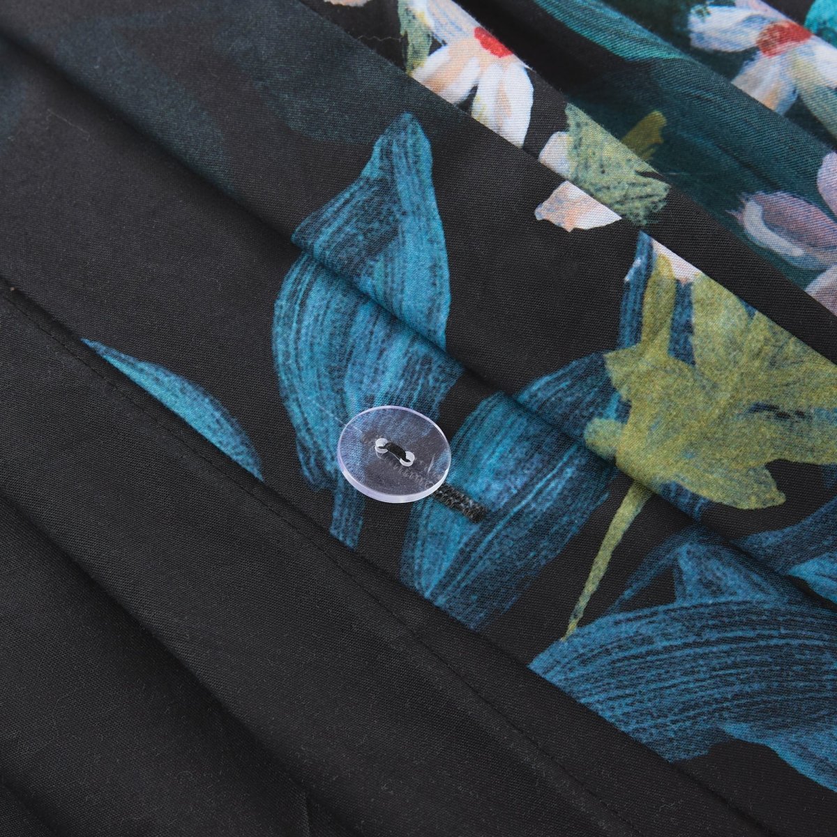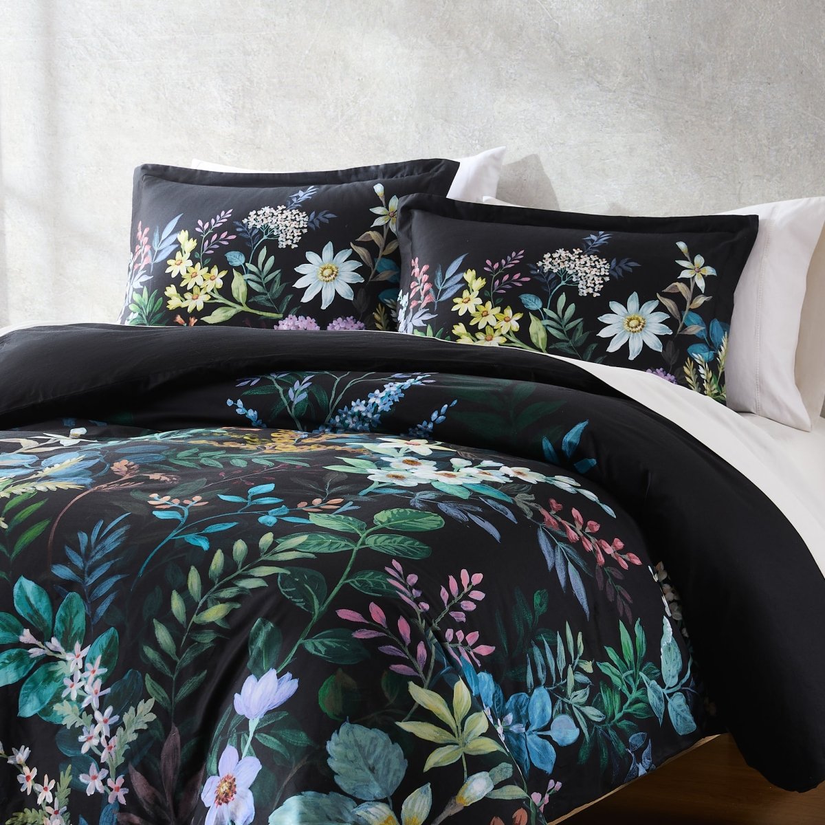 Let your midnight dreams unfold with this floral duvet cover set. The moody botanical print on a rich black canvas adds enchanting drama to any space, great for a modern Victorian or gothic decor style. This 3 piece set includes 1 duvet cover and 2 shams. Add your ideal insert weight for year-round comfort and easily secure it with button closures and corner ties. STANDARD 100 by OEKO-TEX® certified, all components have been tested and certified free from harmful substances. Machine washable.