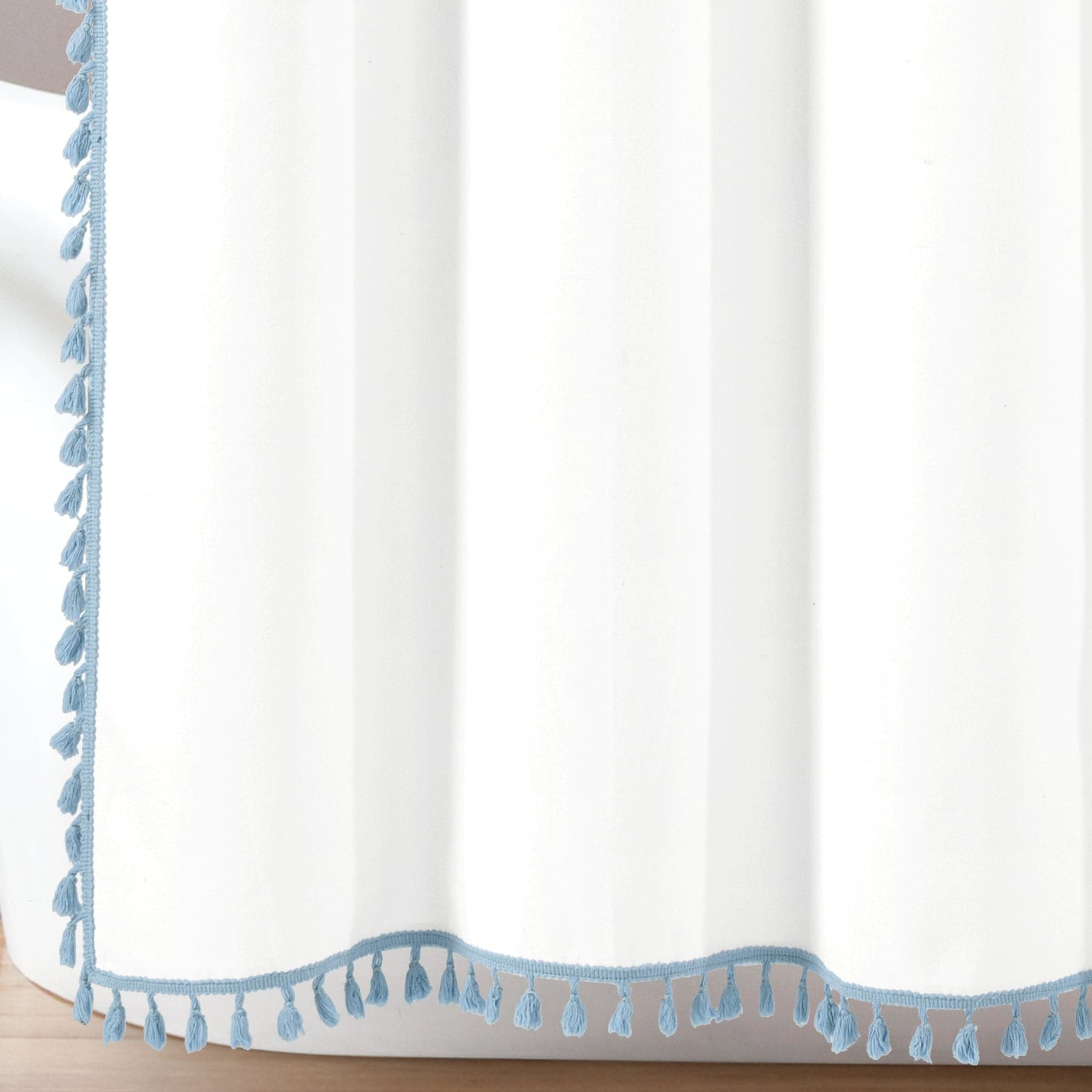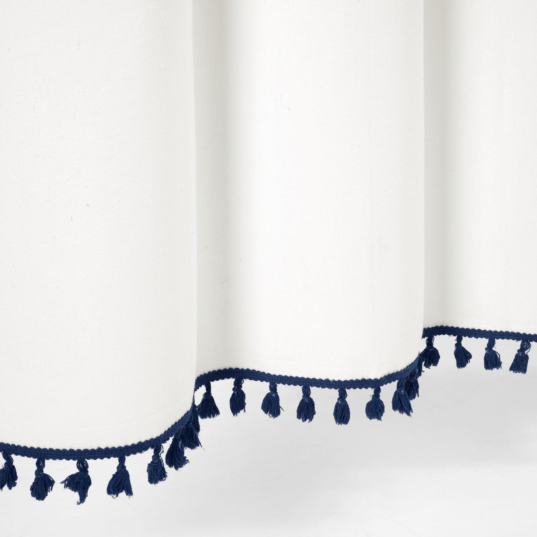 Combine simplicity with your favorite boho accent and you get this stylish Boho Melora Tassel Yarn Dyed Recycled Cotton Blend Shower Curtain. This solid white curtain is anything but boring, featuring a tassel trim on 3 sides, adding the right pop of color to your primary or guest bathroom. This product contains 100% GRS certified recycled material.