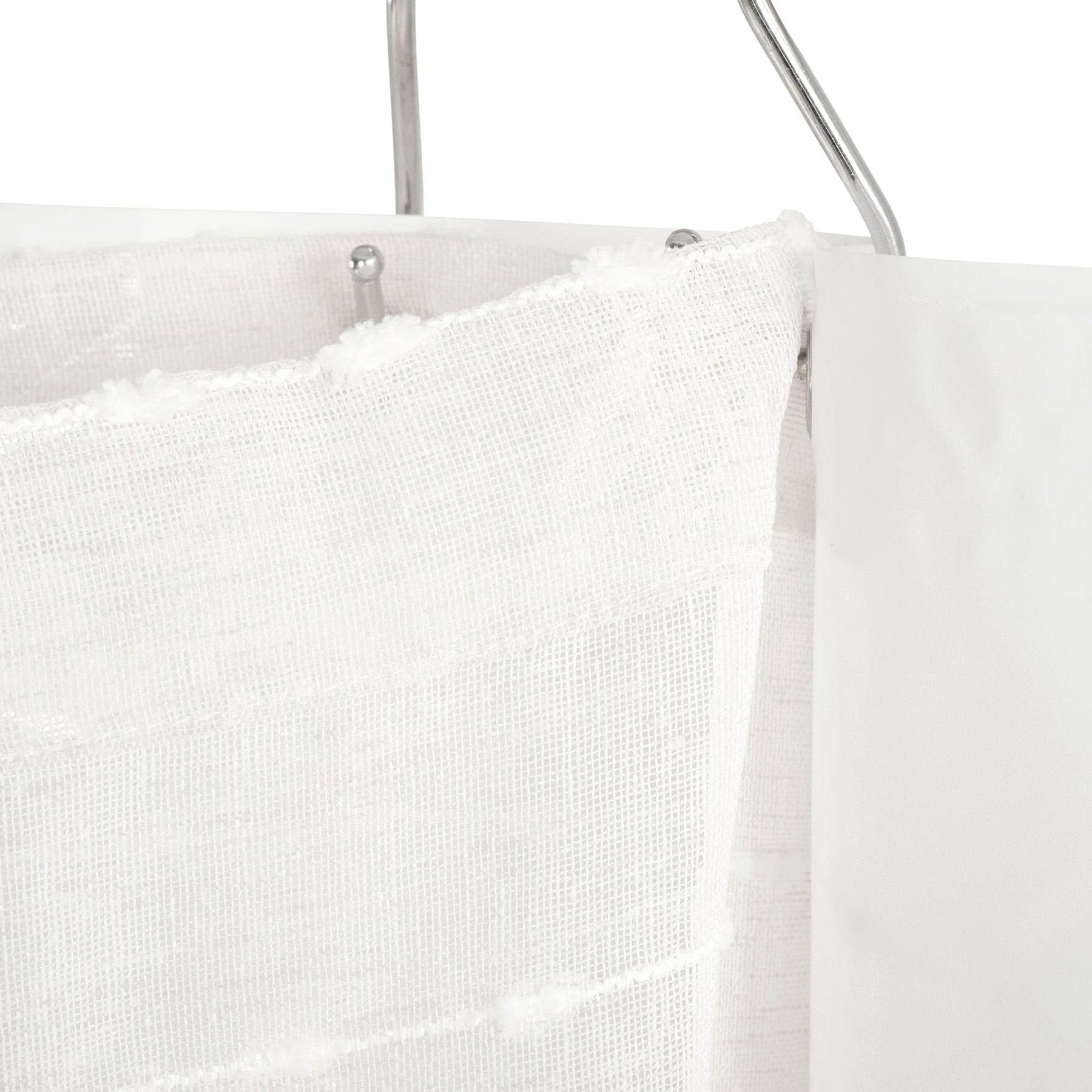 This Farmhouse Textured Sheer With Peva Lining Shower Curtain Set is striped with soft tufts on a sheer background giving dimension within its simplicity. But don’t worry about your privacy, because included with this shower curtain is an unattached white PEVA liner.